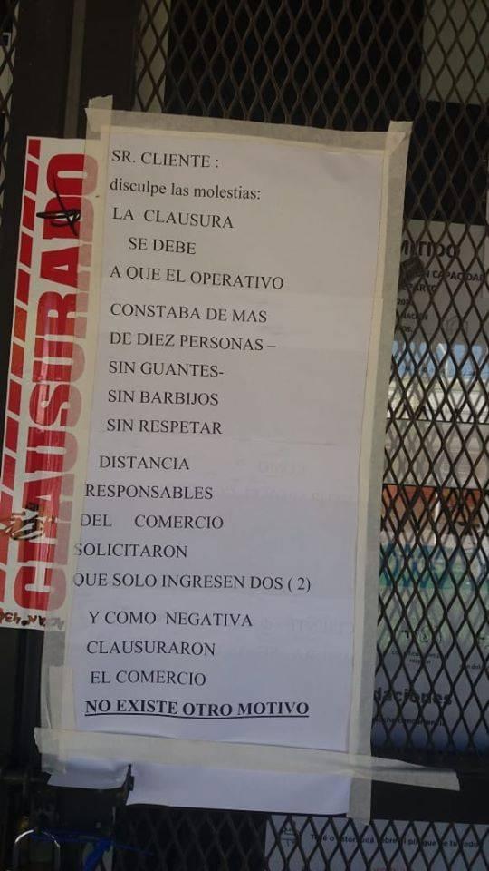 En los primeros minutos de la tarde los propietarios del supermercado pusieron junto a las fajas de clausura -que según pudo saber FM RIEL es por el término de 3 días- un letrero mediante el cual le informan a sus clientes que no se oponían a que se les efectuara una inspección y detallaron los motivos por el que entienden fueron injustamente clausurados.
