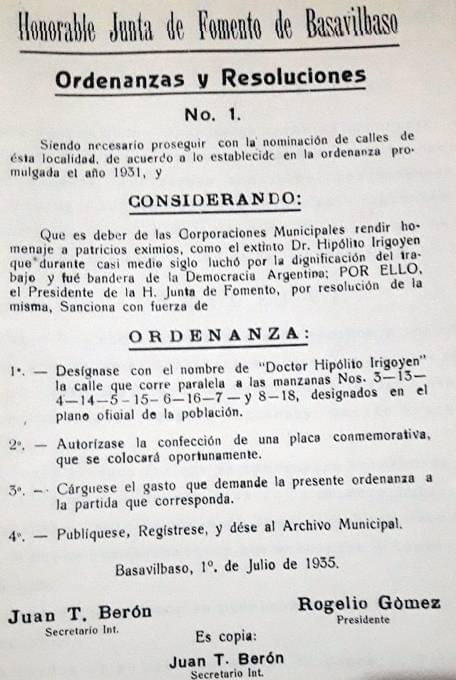 6 - Estas disposiciones que datan de 1931 bajo la administración comunal de Luis Croharé son las más antiguas encontradas, hasta el momento, nombrando a dos arterias importantes de Basavilbaso de comienzos del siglo XX. Serán referenciadas para continuar individualizando otras, inmortalizando hombres y hechos históricos locales y nacionales.