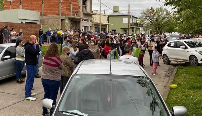 Cuando el grueso de los que había marchado en sus vehículos hasta la zona descendió y se congregó frente al inmueble ubicado sobre la calle Sarmiento del barrio Parroquial comenzaron a escucharse -entre aplausos- gritos con consignas e insultos dirigidos al domicilio del presunto abusador, allí a viva voz demandaban "justicia" y aplaudían mientras algunos hicieron sonar las bocinas de sus vehículos.