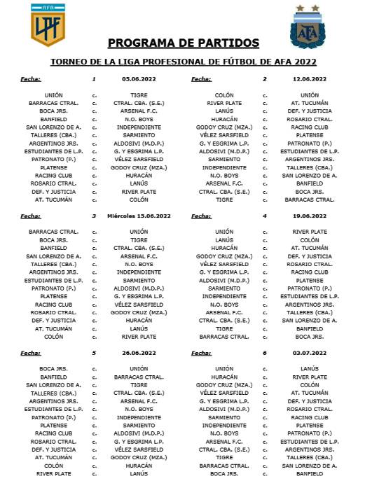 "Para armar este fixture también se tomaron en cuenta todos los compromisos que se pueden generar con los equipos argentinos que afrontan competencias CONMEBOL, los tiempos de descanso de los futbolistas que jugarán en los dos frentes, así como también los casos de los jugadores que deben desempeñarse en la Selección Argentina, como para que esto no afecte el normal potencial de esos conjuntos en nuestro torneo", agregó el comunicado del organismo.