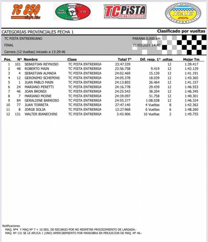 El clima era el mejor así fue que despidieron el sábado. Para el domingo a la mañana claramente se notaba que los pronósticos del tiempo habían sido acertados. Con un clima bárbaro y con tiempo muy acotado para pruebas la docena de autos que se anotaron en la Categoría se disponía a la Clasificación, la que de manera categórica ganó Sebastián Reynoso -de reciente paso por el #TCMouras- quien no dejó dudas de su talento como tampoco de que (gracias al presupuesto con que cuenta) el auto más rápido en el comienzo de la temporada; el "Negro" Almada hizo una gran tarea, al #4 se lo vio más estable doblando mucho mejor y eso fue determinante para que se mezclara entre los mejores 3 de la tanda única.