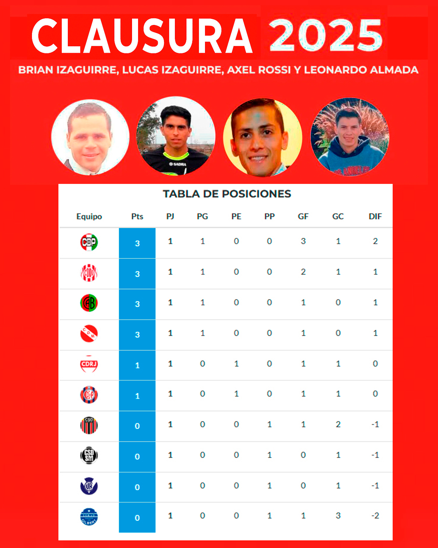 La emoción volvió a sentirse en cada rincón de la región: este fin de semana arrancó el Torneo Clausura 2025 de la Liga Regional de Fútbol, que, al igual que el Apertura, lleva el nombre de cuatro jóvenes que dejaron una huella imborrable en el deporte local -Brian Izaguirre, Lucas Izaguirre, Axel Rossi y Leonardo Almada-, víctimas de un trágico siniestro vial en junio de 2024.