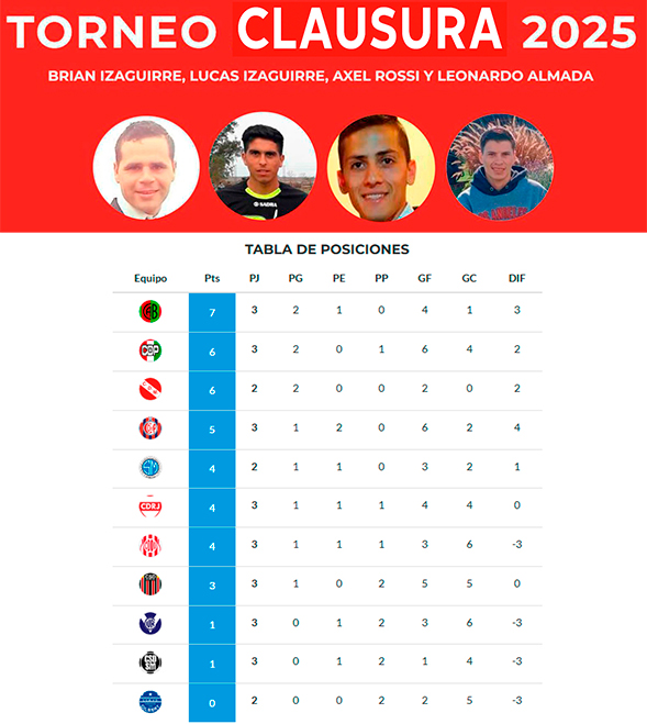 Este fin de semana se disputó la tercera fecha del Torneo Clausura 2025 de la Liga Regional de Fútbol, certamen que -al igual que el Apertura- recuerda a Brian Izaguirre, Lucas Izaguirre, Axel Rossi y Leonardo Almada, los cuatro trabajadores que perdieron la vida el 20 de junio de 2024 en un siniestro en la Ruta 39.