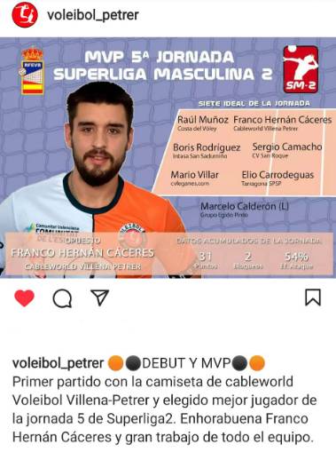Vóley | El basavilbasense Franco Hernán Cáceres fue fundamental para que el Cableworld Voleibol Villena-Petrer lograra una importante victoria en la 5ª jornada de Liga, en concreto contra CV Utrera.