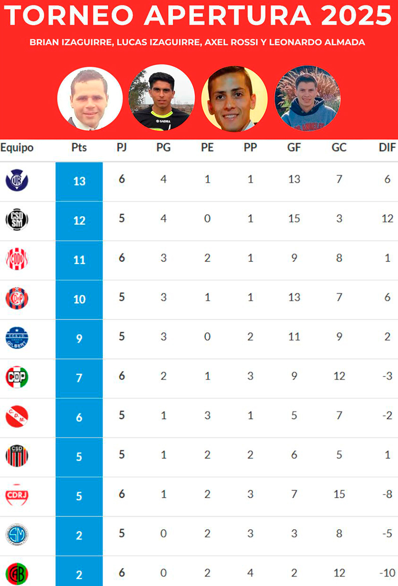 Con estos resultados, la tabla se ajusta y promete una recta final apasionante en el Apertura “Brian Izaguirre, Lucas Izaguirre, Axel Rossi y Leonardo Almada”.