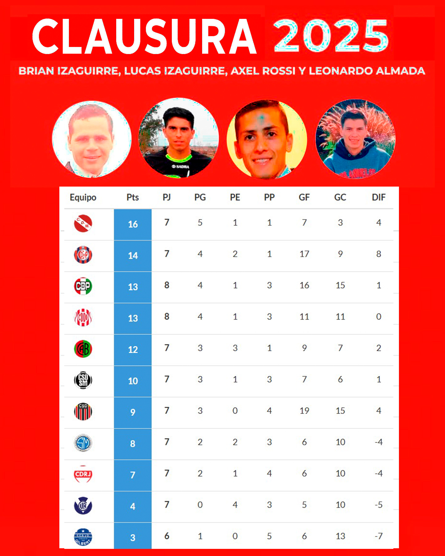 Cabe recordar que el equipo de San Justo aún tiene pendiente el partido de la séptima fecha ante Gilbert, postergado por la celebración patronal.
