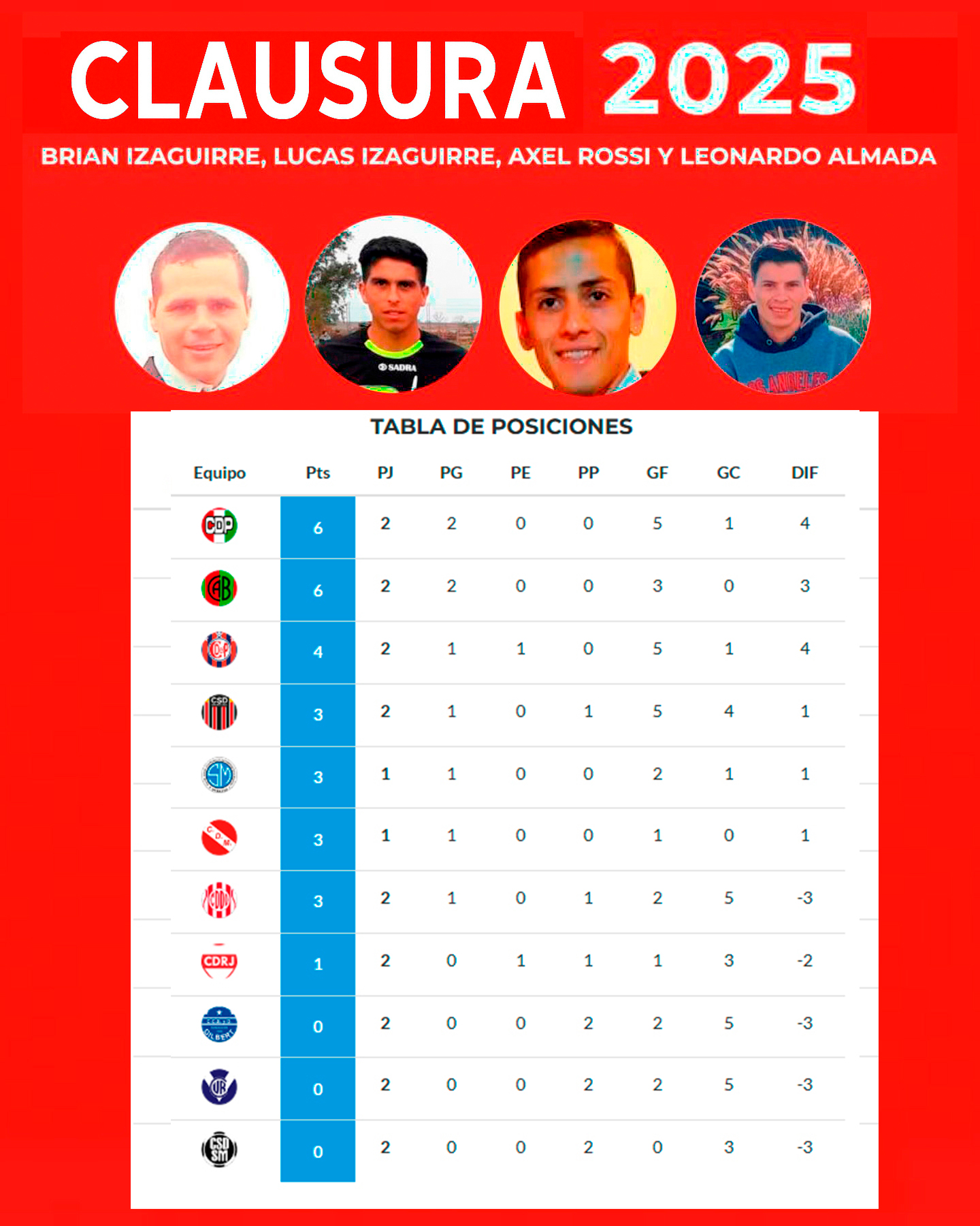 Este fin de semana volvió a rodar la pelota en la Liga Regional de Fútbol con la reanudación del Torneo Clausura 2025, que al igual que el Apertura lleva el nombre de Brian Izaguirre, Lucas Izaguirre, Axel Rossi y Leonardo Almada, los cuatro trabajadores que perdieron la vida el 20 de junio de 2024 en un siniestro vial en la Ruta 39, cuando un auto oficial, conducido por un funcionario provincial, a quien se le comprobó alcohol en sangre, impactó el vehículo en el que se trasladaban.