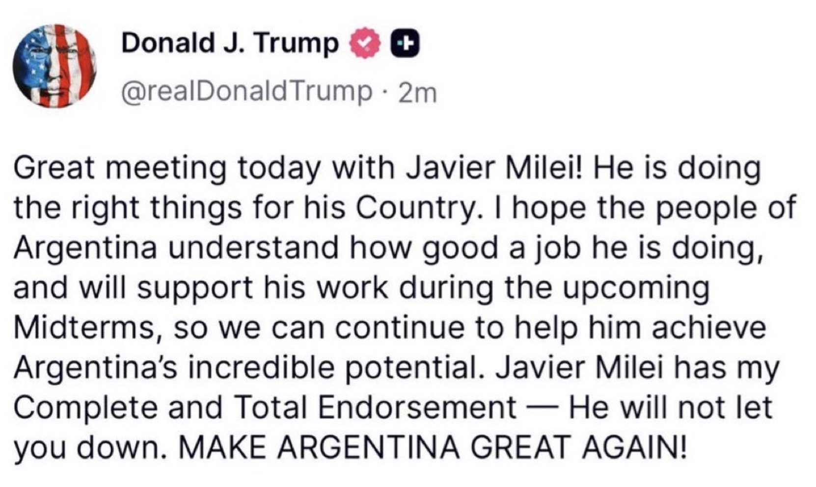“Javier Milei cuenta con mi total apoyo. No los defraudará. ¡Hagamos que Argentina vuelva a ser grande!”, cerró Trump, utilizando una frase similar a su histórico lema de campaña, Make America Great Again.