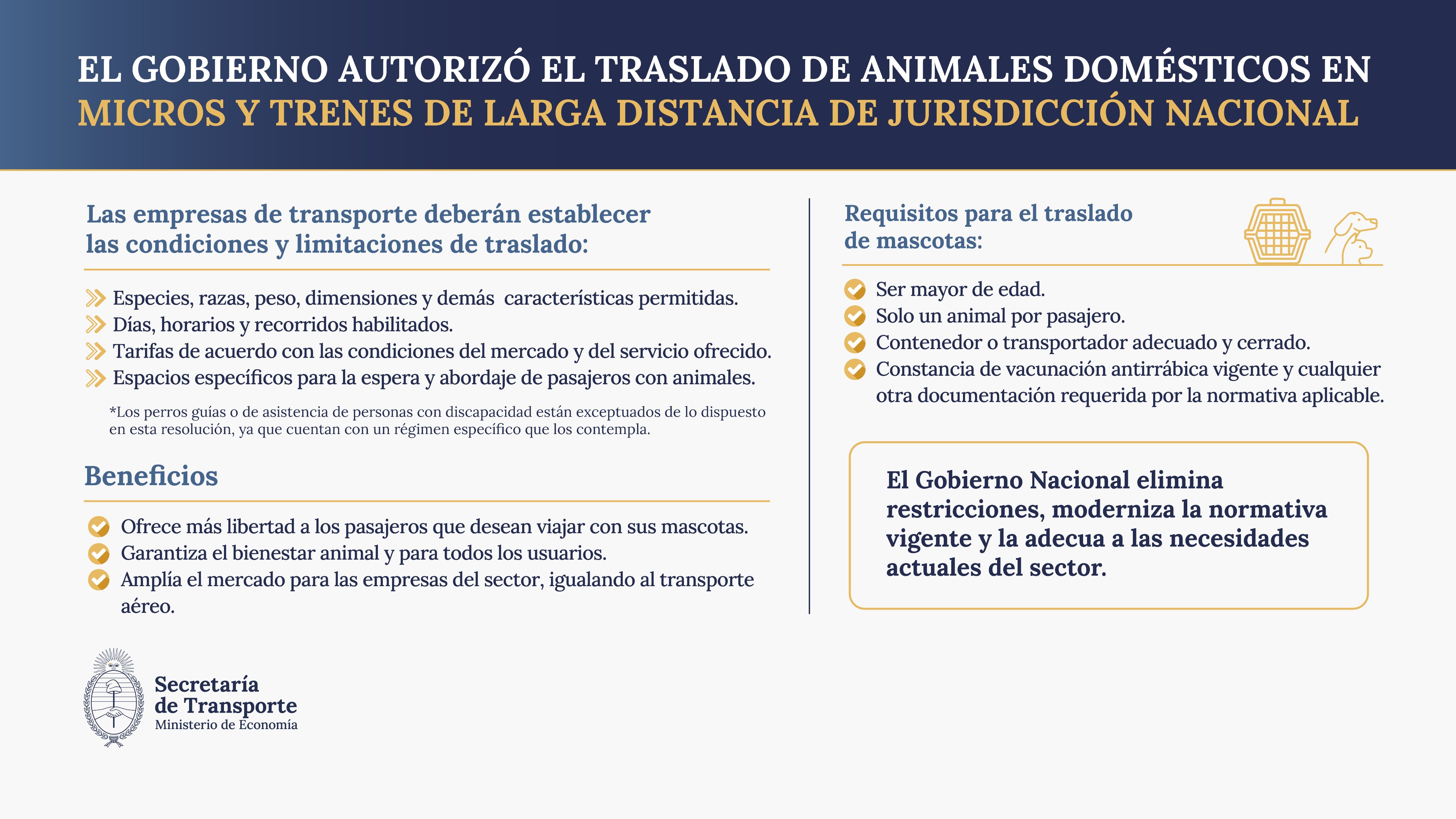 El Ministerio de Economía informó que la Secretaría de Transporte autorizó, mediante una nueva resolución, el traslado de animales domésticos en los servicios ferroviarios y automotores de larga distancia bajo jurisdicción nacional.