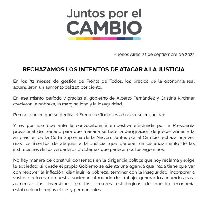 “A lo único que se dedica el Frente de Todos es a buscar su impunidad. Y es por eso que ante la convocatoria intempestiva efectuada por la Presidenta provisional del Senado para que mañana se trate la designación de Jueces afines y la ampliación de la Corte Suprema de la Nación, Juntos por el Cambio rechaza una vez más los intentos de ataques a la Justicia, que generan un distanciamiento de las instituciones de los verdaderos problemas que padecemos los argentinos”, expresaron en un comunicado.