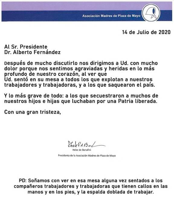 "Después de mucho discutirlo nos dirigimos a usted con mucho dolor porque nos sentimos agraviadas y heridas en lo más profundo de nuestro corazón al ver que usted sentó en su mesa a todos los que explotan a nuestros trabajadores y trabajadoras, y a los que saquearon el país", escribió Bonafini.