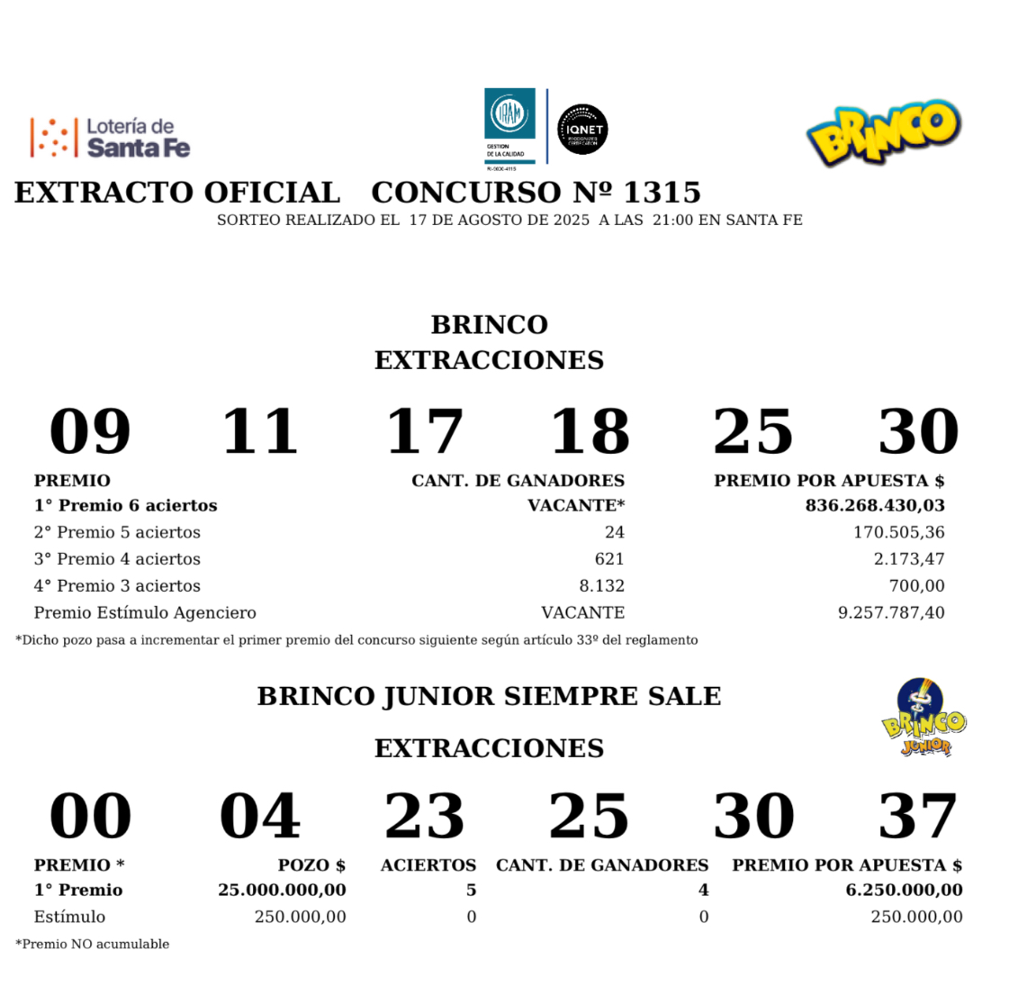 En el Brinco, concurso 1.315 sorteo del domingo 17 de agosto con seis aciertos $836.268.430 quedó vacante.