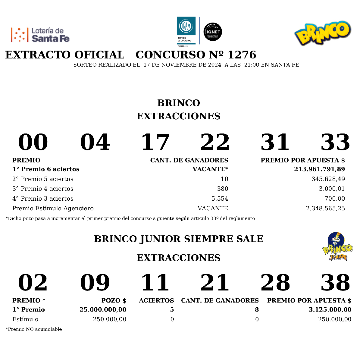 En el Brinco, concurso 1.276 sorteo del domingo 17 de noviembre con seis aciertos $213.961.792 vacante.