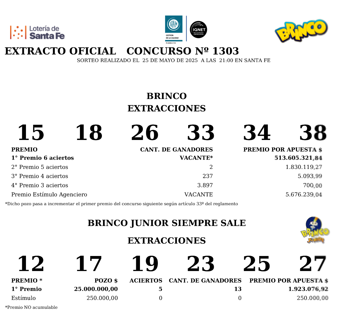 En el Brinco, concurso 1.303 sorteo del domingo 25 de mayo con seis aciertos $513.605.322 quedó vacante.
