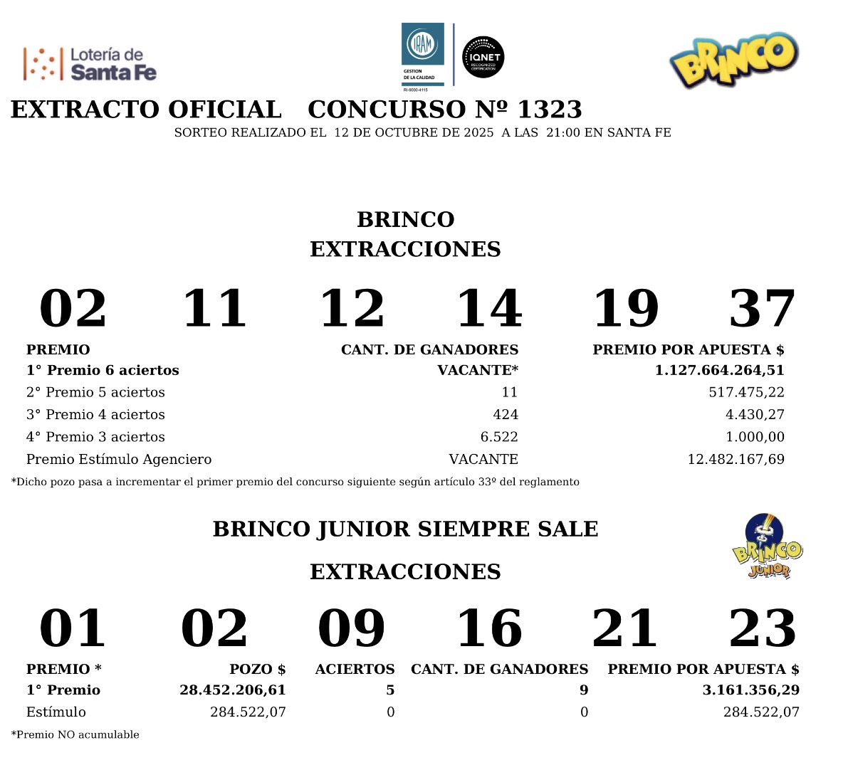 El Brinco, concurso 1.323 sorteo del domingo 12 de octubre con seis aciertos $1.127.664.265 quedó vacante.