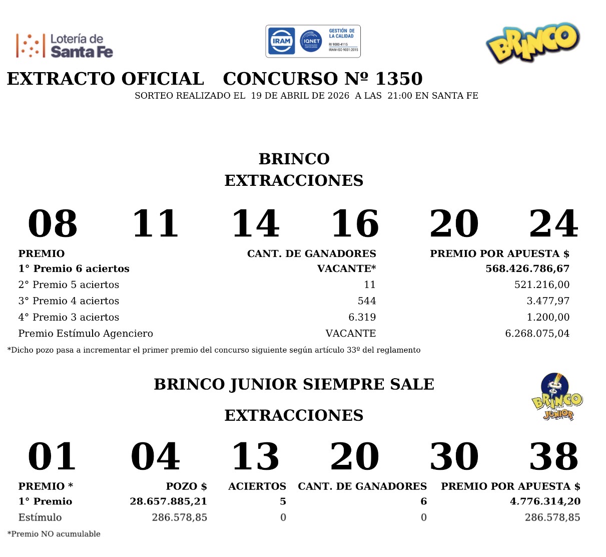 El Brinco, concurso 1.3450sorteo del domingo 19 de abril con seis aciertos el pozo vacante $568.426.787.