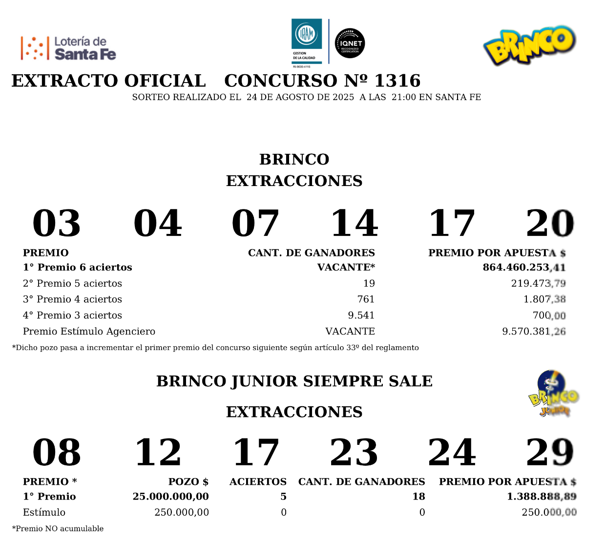 En el Brinco, concurso 1.316 sorteo del domingo 24 de agosto con seis aciertos $864.460.253 quedó vacante.