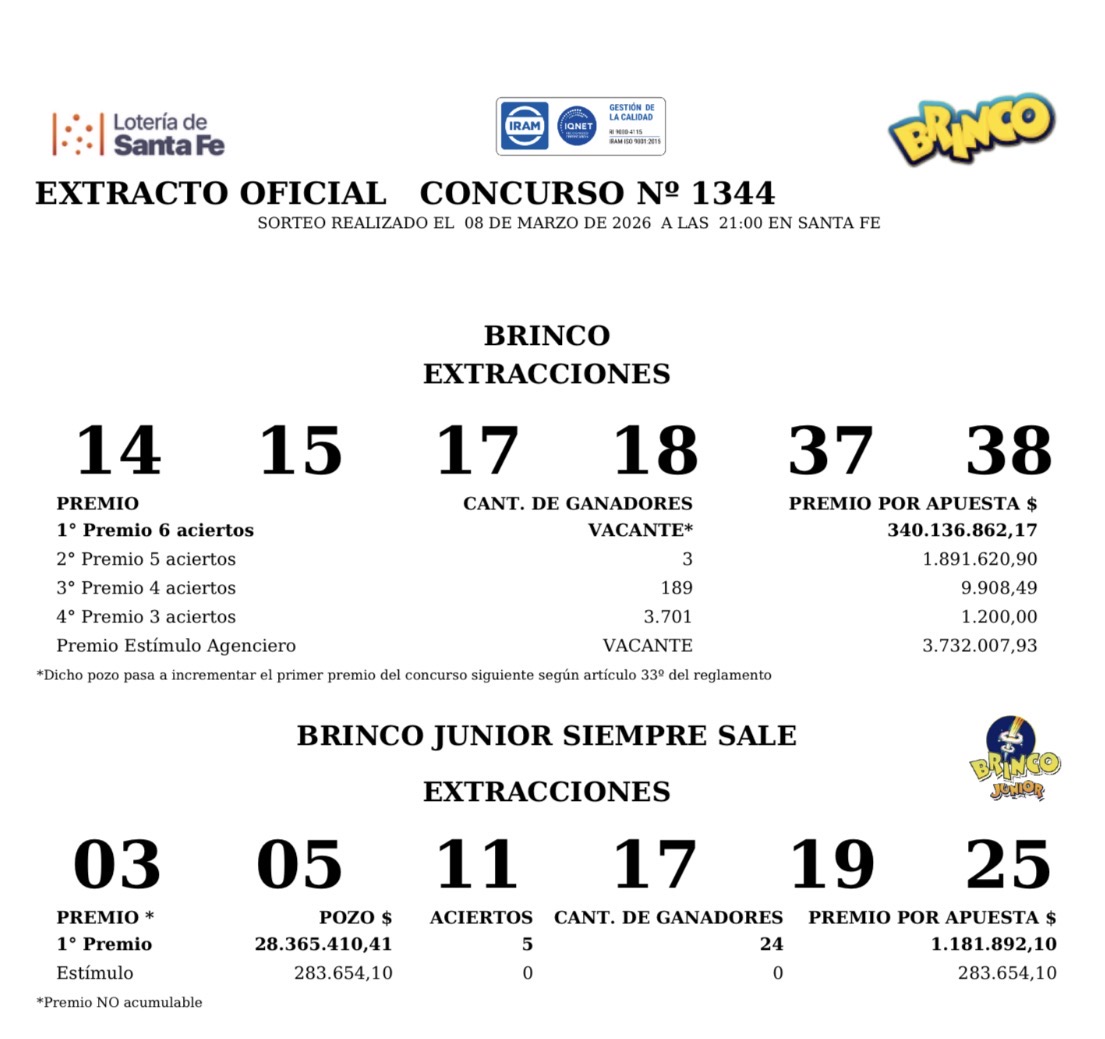 El Brinco, concurso 1.344 sorteo del domingo 8 de marzo con seis aciertos el pozo vacante $340.136.862.
