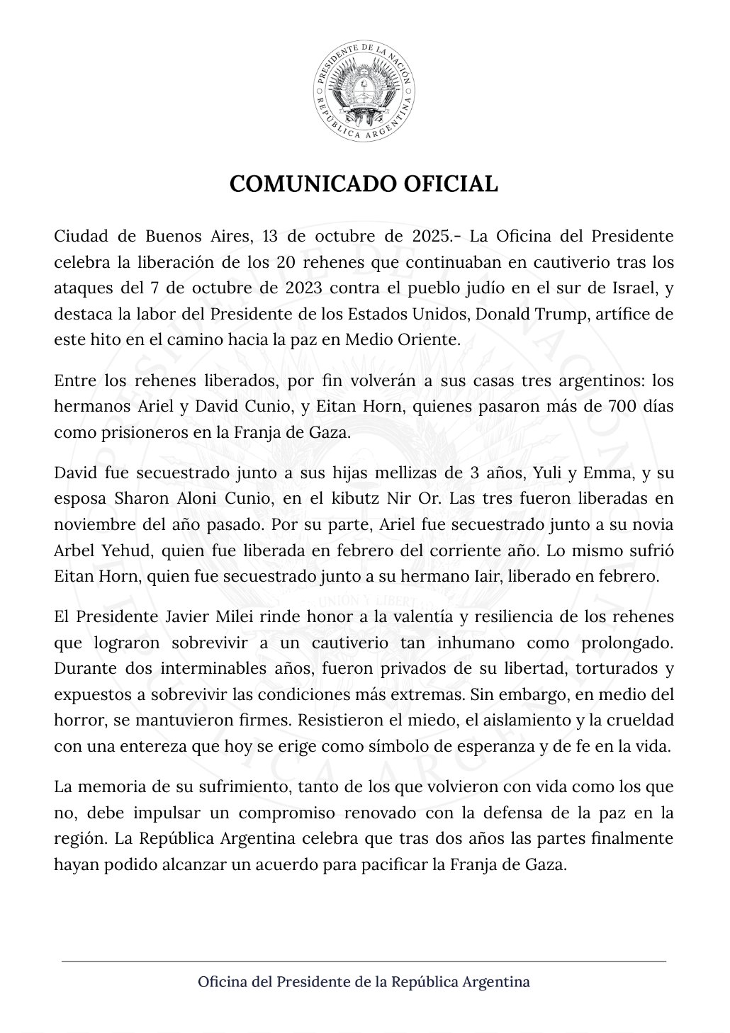 Entre los liberados, se encuentran tres argentinos que volverán a su casa luego de estar 700 días detenidos. Según el texto publicado desde el Poder Ejecutivo, las personas liberadas continuaban en cautiverio “tras los ataques del 7 de octubre contra el pueblo judío en el sur de Israel” y se destacó el accionar del Presidente de Estados Unidos, Donald Trump, que fue calificado como “el artífice de este hito en camino hacia la paz en Medio Oriente” .