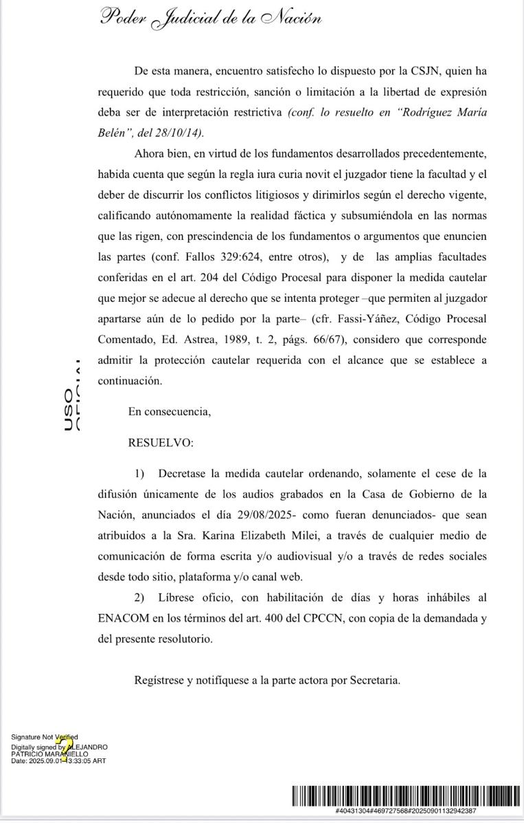 Según la resolución, la cautelar se aplica únicamente a los audios anunciados el 29 de agosto y atribuidos a la funcionaria; distintos medios consignan que el magistrado es Alejandro Patricio Maraniello.