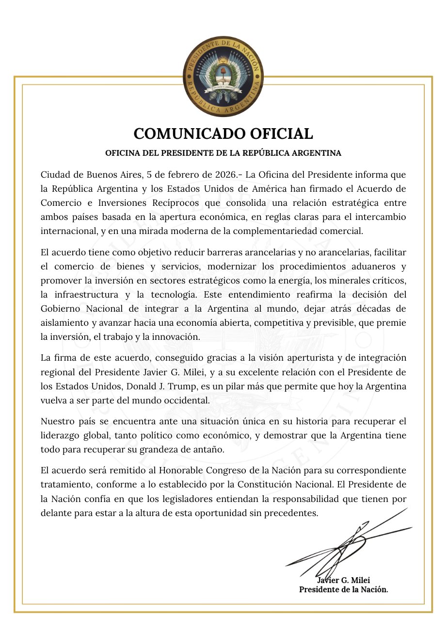 Este entendimiento “reafirma la decisión del Gobierno de integrar a la Argentina al mundo, dejar atrás décadas de aislamiento y avanzar hacia una economía abierta, competitiva y previsible, que premie la inversión, el trabajo y la innovación”.