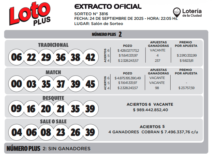 Este miércoles 24 de septiembre en el sorteo Tradicional del Loto Plus salieron 06 - 22 - 29 - 36 - 38 - 42. Con 6 aciertos: vacante de $428.027.173.