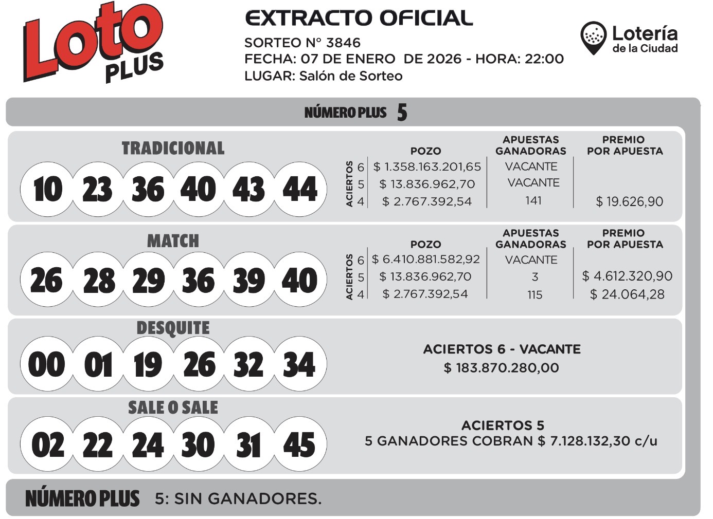 Este miércoles 7 de enero en el sorteo Tradicional del Loto Plus salieron 10 - 23- 36 - 40 - 43 - 44.