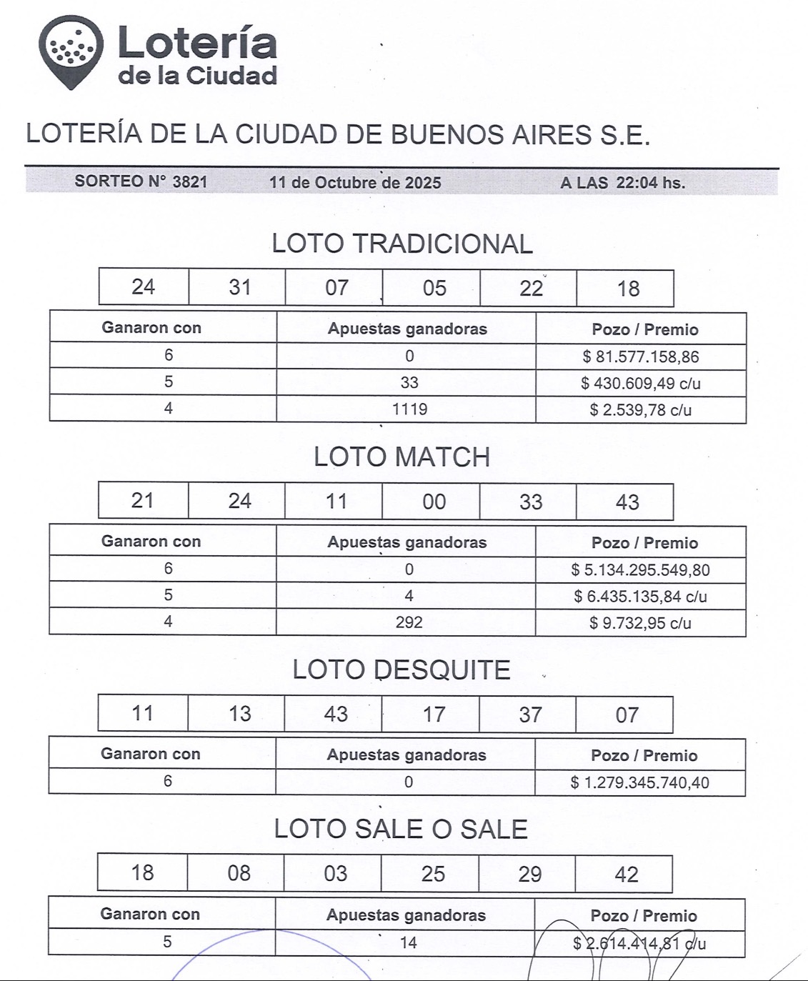 Sociedad | Este sábado, 11 de octubre, en el sorteo Tradicional del Loto Plus su pozo quedó vacante, como en el resto de las versiones. El Sale o Sale fue para 14 ganadores.