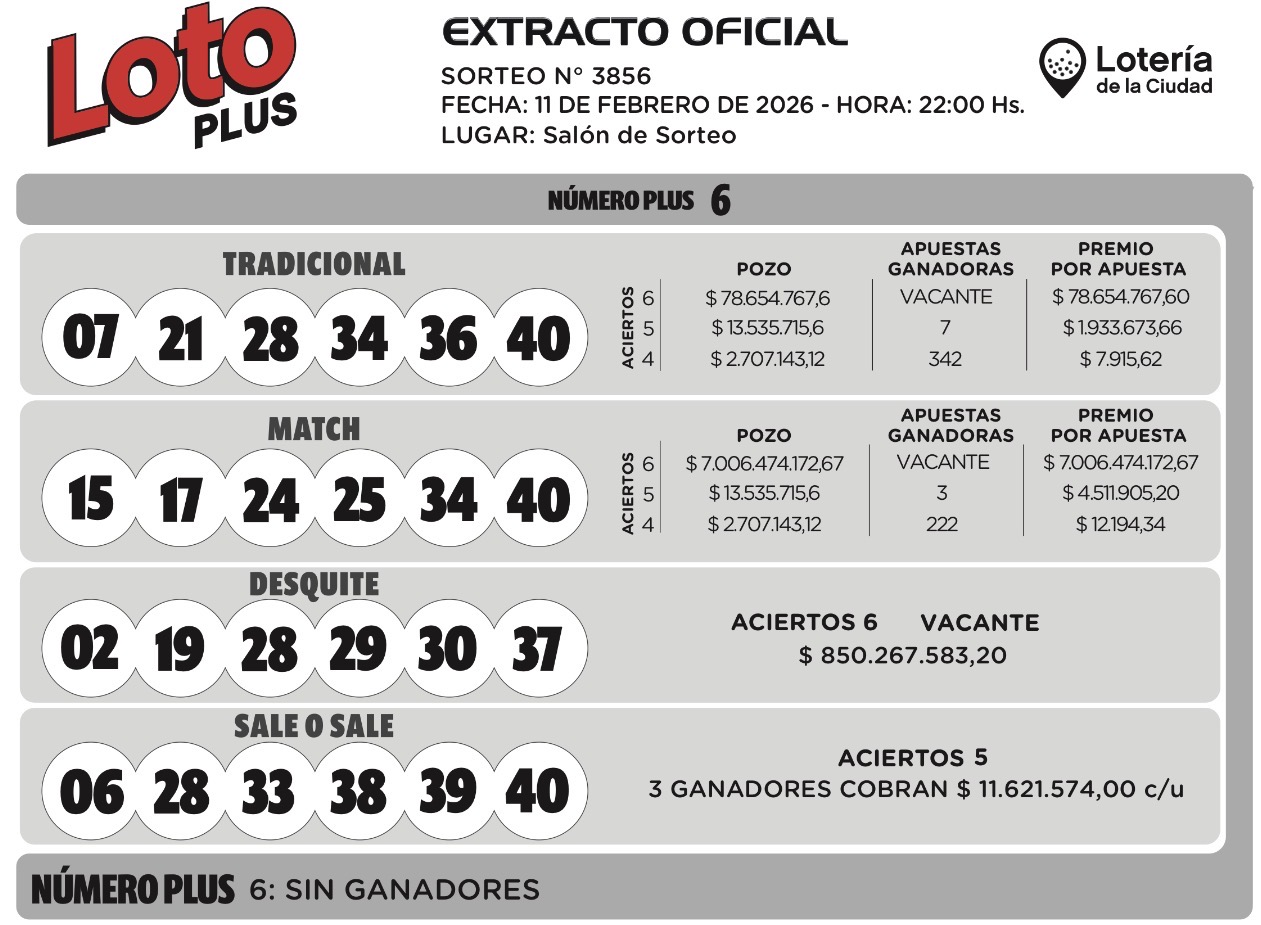Sociedad | Este miércoles 11 de febrero, en el sorteo Tradicional del Loto Plus pozo quedó vacante, al igual que las versiones Match y Desquite; con el Sale o Sale hubo tres afortunados ganadores, cobrarán cada uno más de $11 millones.