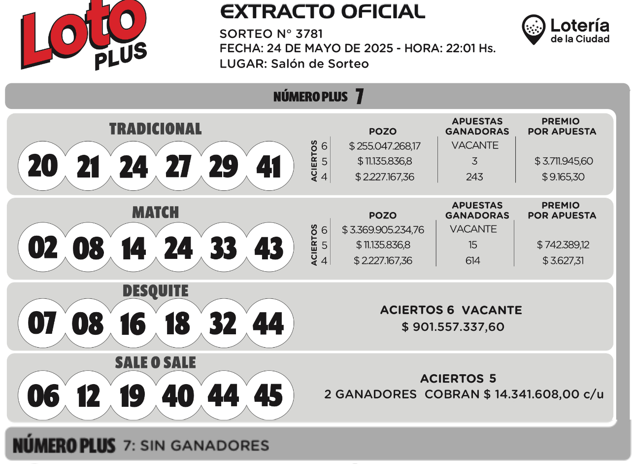El sorteo del Loto Plus 3.781 realizado el sábado 24 de mayo en la versión Tradicional con un pozo de $255.047.268 quedó vacante.