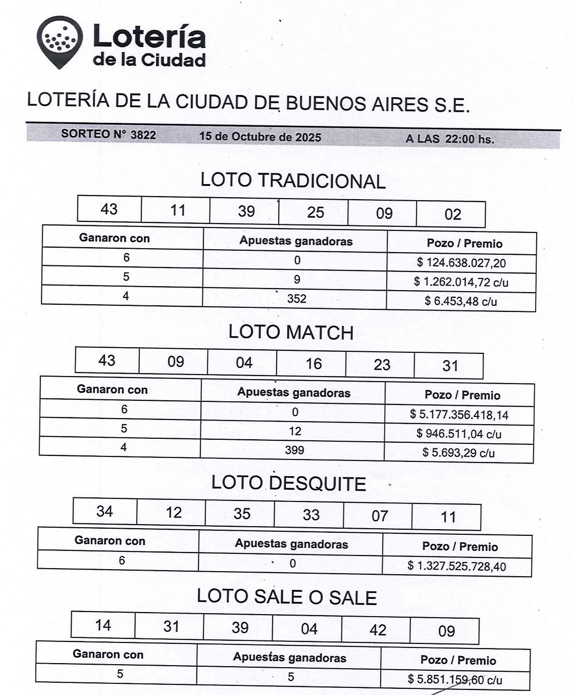 En el Sale o Sale: 04 - 09 - 14 - 31 - 39 - 42. Con 5 aciertos 5 ganadores que cobrarán cada uno $5.851.159.