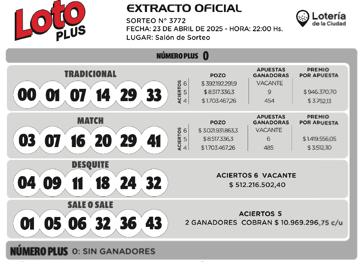 El sorteo del Loto Plus 3.772 realizado el miércoles 23 de abril en la versión Tradicional con un pozo de $392.192.291 quedó vacante.