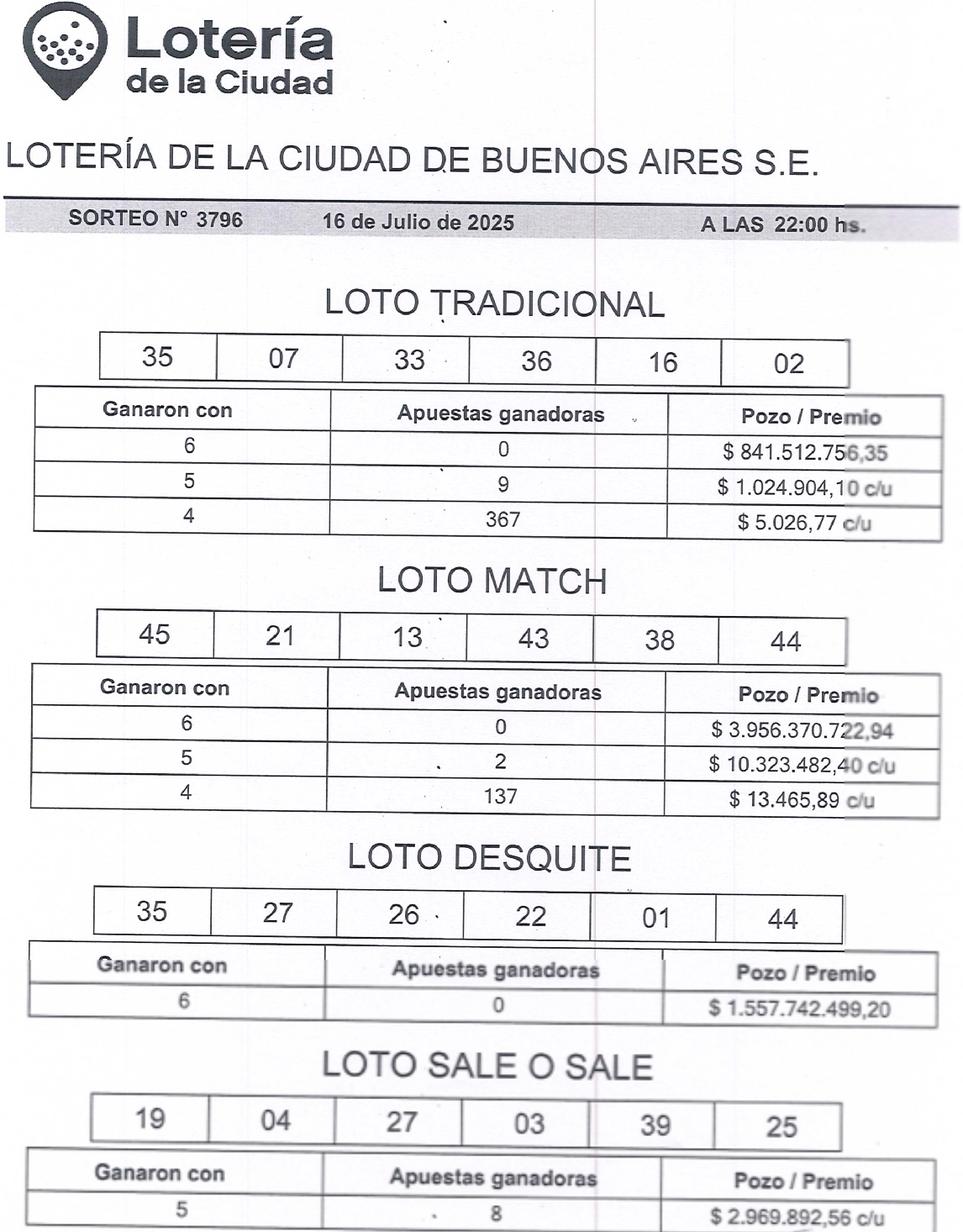 El sorteo del Loto Plus 3.796 realizado el miércoles 16 de julio en la versión Tradicional con un pozo de $841.512.756 quedó vacante.
