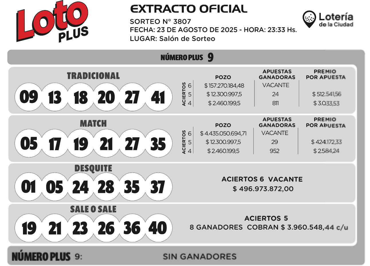 En el Sale o Sale hubo 8 ganadores, con cinco aciertos de estos números 19-21-23-26-36-40, cobrarán cada uno $3.960.548.