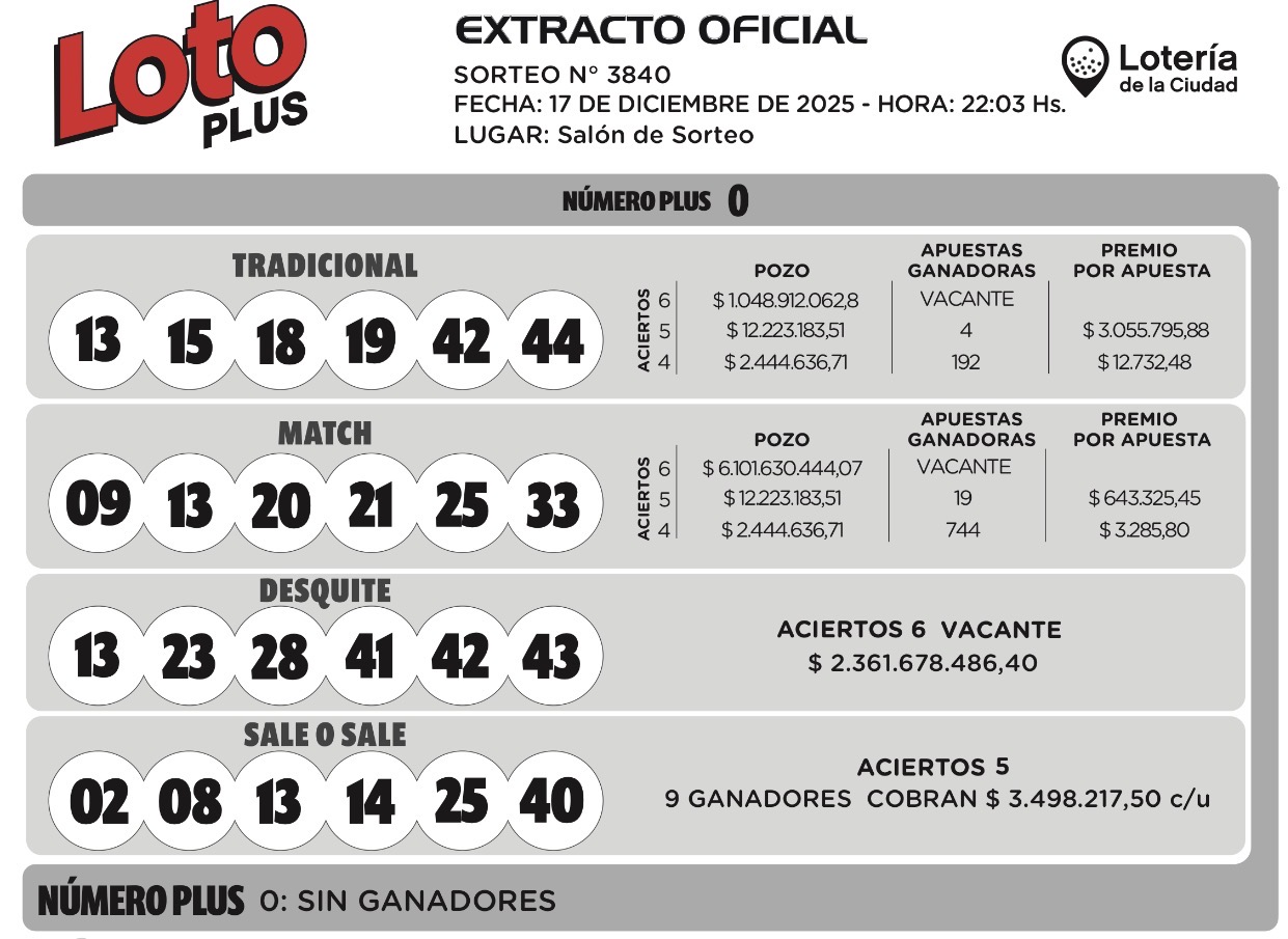 Sociedad | Este miércoles 17 de diciembre, en el sorteo Tradicional del Loto Plus su pozo quedó vacante, como en el resto de las versiones. El Sale o Sale fue para nueve ganadores.