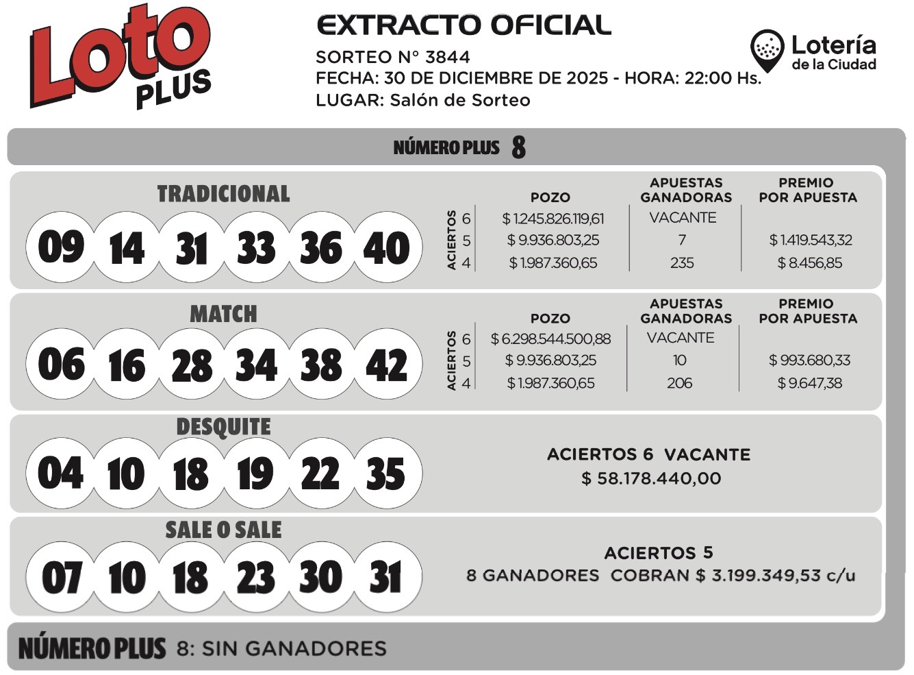 Sociedad | Este martes 30 de diciembre, en el sorteo Tradicional del Loto Plus su pozo quedó vacante, y supera los $1.200 millones.