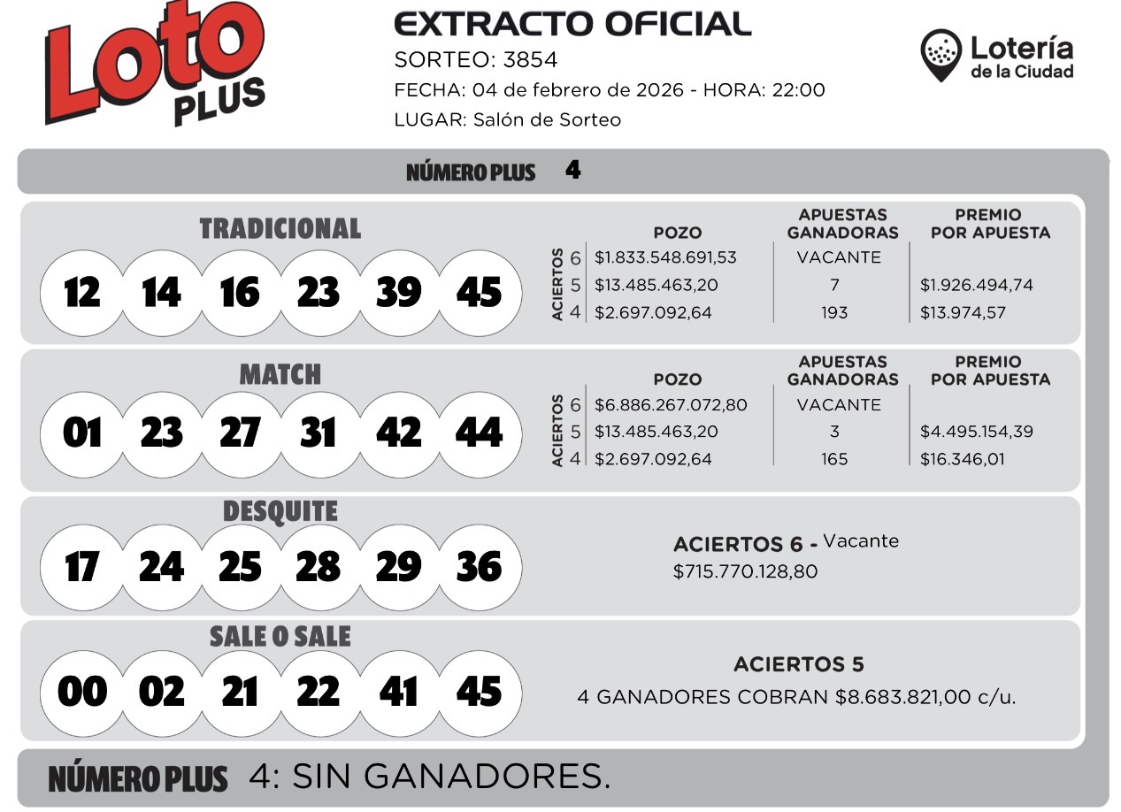Este miércoles 4 de febrero en el sorteo Tradicional del Loto Plus salieron 12 - 14- 16 - 23 - 39 - 45.