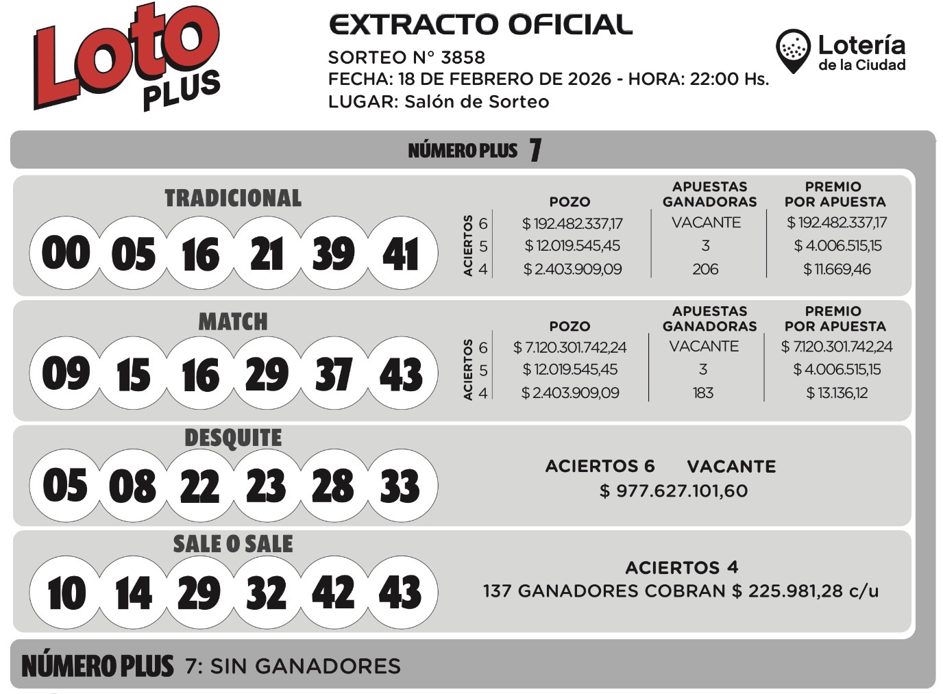 Sociedad | Este miércoles, 18 de febrero, en el sorteo Tradicional del Loto Plus pozo quedó vacante, al igual que las versiones Match y Desquite; con el Sale o Sale hubo cuatro apostadores se reparten el pozo.