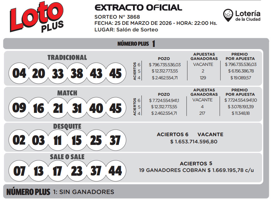 Este miércoles 25 de marzo en el sorteo Tradicional del Loto Plus salieron 04 - 20 - 33 - 38 - 43 - 45.