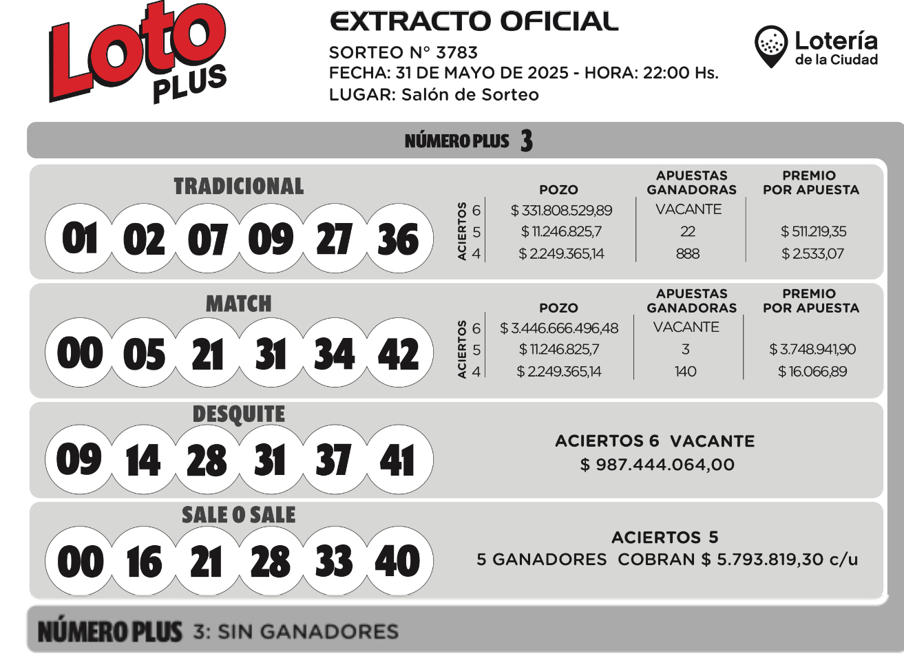 El sorteo del Loto Plus 3.783 realizado el sábado 31 de mayo en la versión Tradicional con un pozo de $331.808.529 quedó vacante.