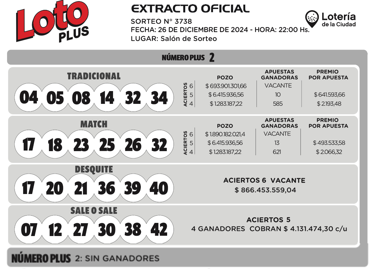 El sorteo del Loto Plus 3.738 realizado el jueves 26 de diciembre en su el Tradicional $693.901.301 vacante.