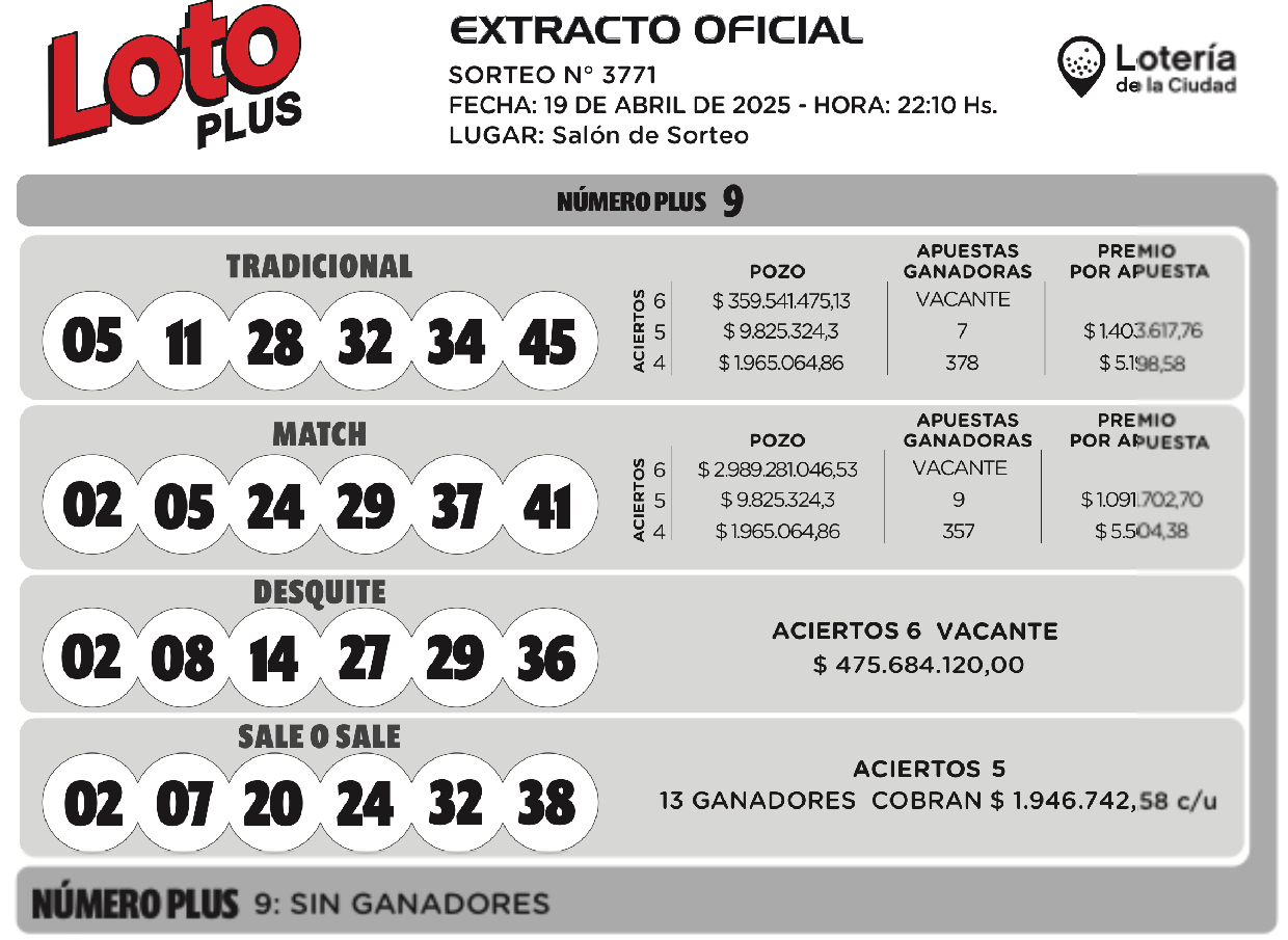 El sorteo del Loto Plus 3.771 realizado el sábado 19 de abril en la versión Tradicional con un pozo de $359.541.475 quedó vacante.