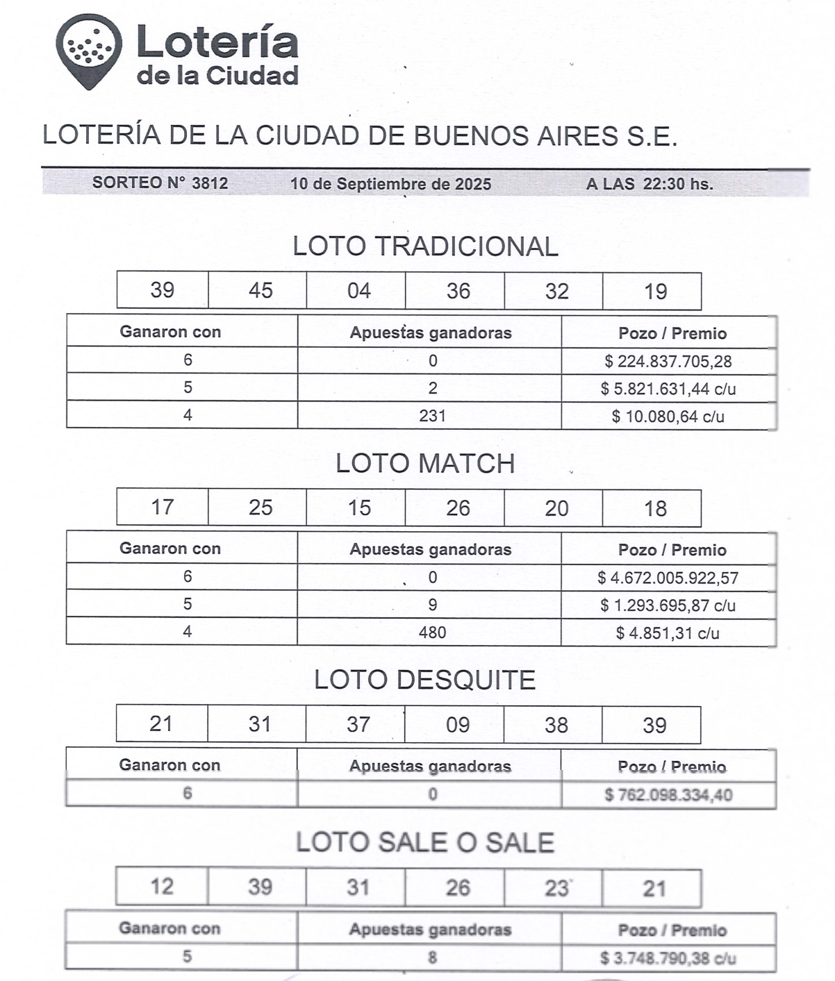 En el Sale o Sale hubo 8 ganadores, con cinco aciertos de estos números 12-21-23-26-31-30, cobrarán cada uno $3.748.790.