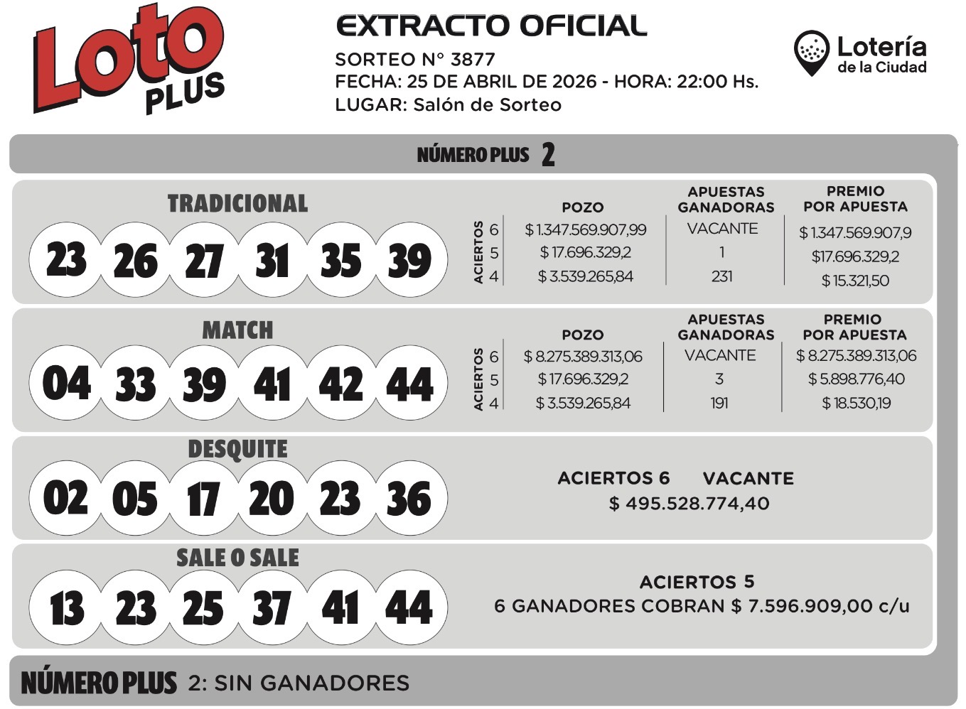 Este sábado 25 de abril en el sorteo Tradicional del Loto Plus salieron 23 - 26 - 27 - 31 -35 - 39.