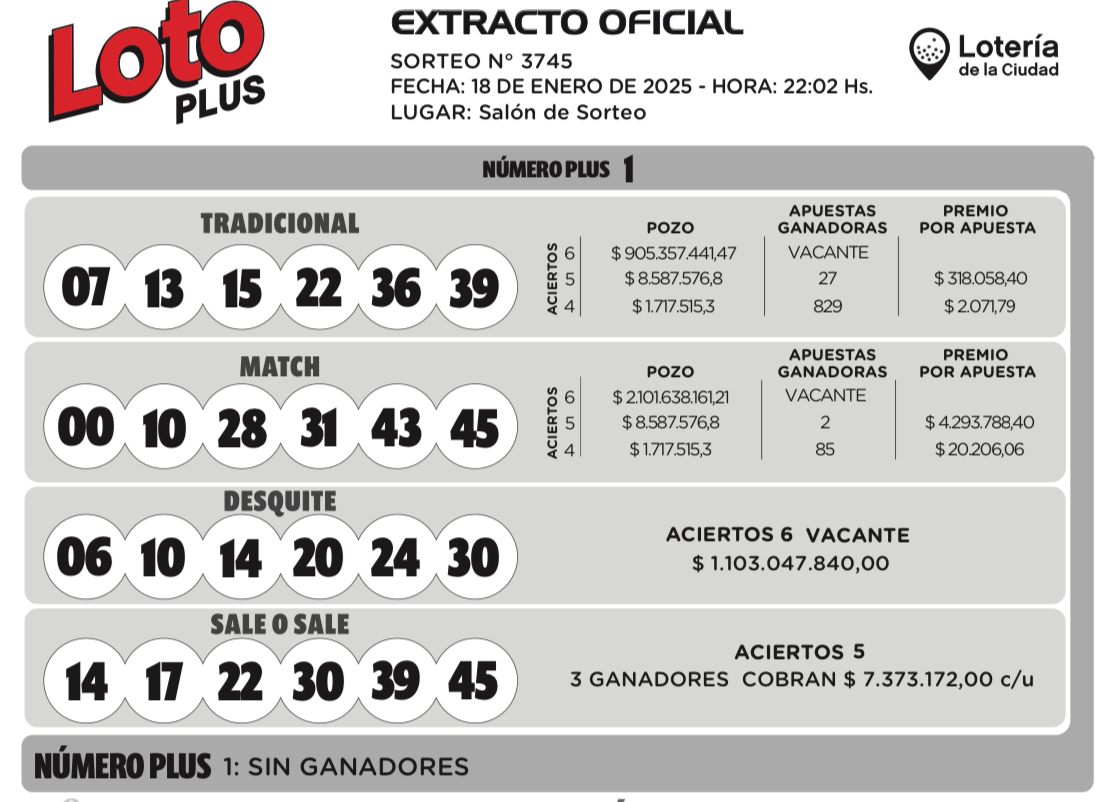 El sorteo del Loto Plus 3.745 realizado el sábado 18 de enero en su el Tradicional $905.357.441 vacante.