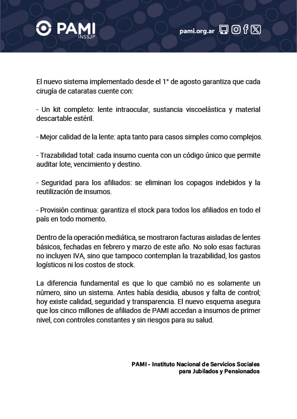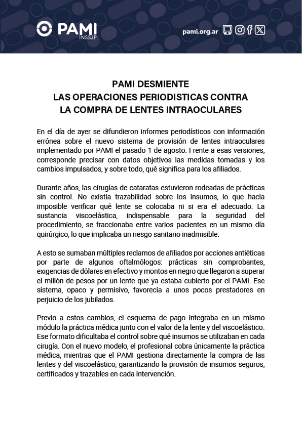 Además, recordaron que otros financiadores del sistema abonan cifras más altas: la obra social del Poder Judicial paga $740.000 por el mismo procedimiento y prepagas como OSDE hasta $1.148.016, mientras que en PAMI el costo total de lente más práctica asciende a $565.000.