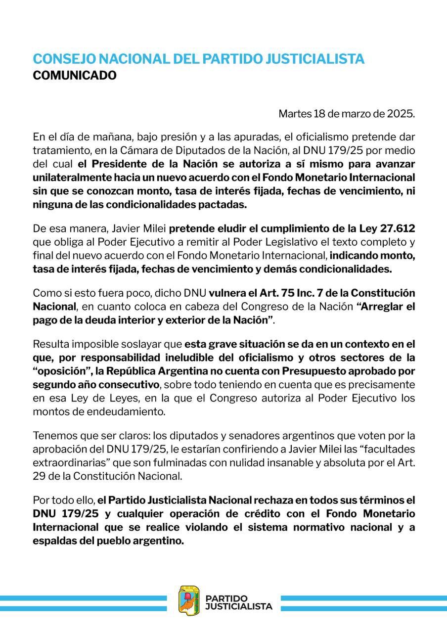 Política | El Consejo Nacional del Partido Justicialista emitió un comunicado en el que rechaza enérgicamente el DNU 179/25, impulsado por el oficialismo para ser tratado en la Cámara de Diputados de la Nación. Según el partido, este DNU permitiría al Presidente Javier Milei avanzar unilateralmente en un nuevo acuerdo con el FMI sin revelar detalles clave como el monto, la tasa de interés, las fechas de vencimiento o las condicionalidades pactadas.