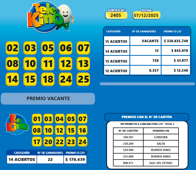 Sociedad | Aquí el resultado del sorteo 2.405 del Telekino que en su versión tradicional con un pozo de más de $330 millones quedó vacante, mientras que el pozo del Rekino fue para veintidos apostadores que se lleva más de $170 mil para cada uno.