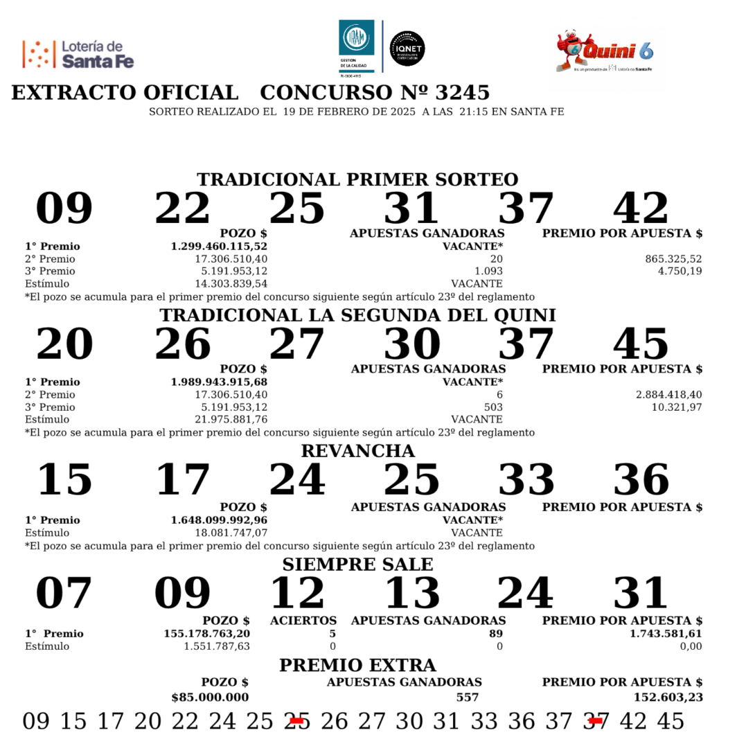 Este miércoles, 19 de febrero, en el sorteo Tradicional del Quini 6 salieron el 09-22-25-31-37-42. Ningún apostador acertó todos los números y el pozo de $1.299.460.115 quedó vacante.