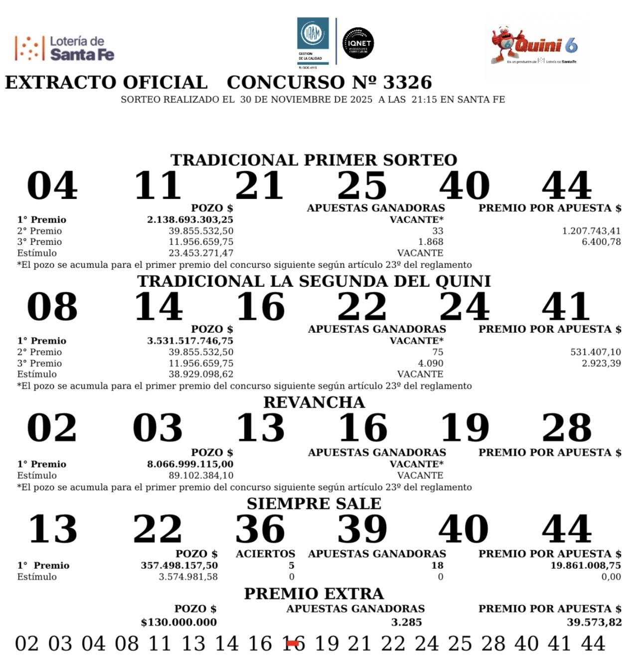 Este domingo 30 de noviembre se sorteó el concurso N° 3.326 del Quini 6, de la Lotería de Santa Fe.